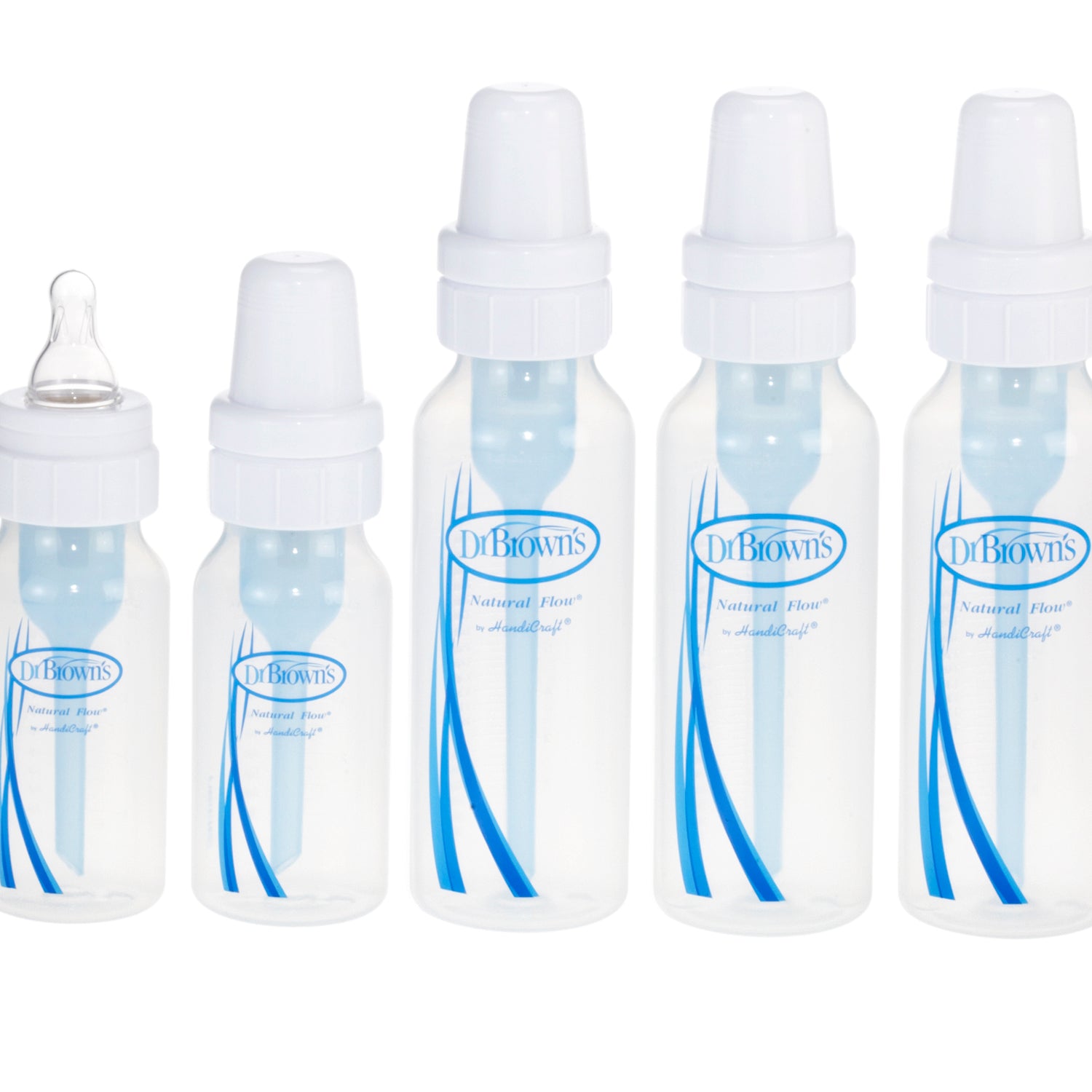 The Dr. Brown's Natural Flow Standard Baby Bottles offer a wonderful feeding experience with innovative vent technology. Dr Brown's bottles use a patented 2-piece internal vent system for your baby's comfort. This system creates positive-pressure flow for vacuum-free feeding that is similar to breastfeeding. The breast milk or formula flows freely without nipple collapse. As the baby feeds, air is channeled from the nipple collar through the vent system to the back of the bottle. Air never mixes with the breast milk or formula so oxidation is prevented, thereby maintaining essential vitamins such as C, A and E. The vent system eliminates air bubbles in the formula or milk, which helps to reduce feeding problems like colic, spit-up, burping and gas. Dr. Brown's bottles are completely BPA, PVC, lead and phthalate free for your baby's safety. The Newborn Feeding Set comes with 3 8oz/240ml Standard bottles, 2 4oz/120ml Standard bottle, 2 extra Level-Two silicone nipples, 2 Storage/Travel caps and 3 cleaning brush.