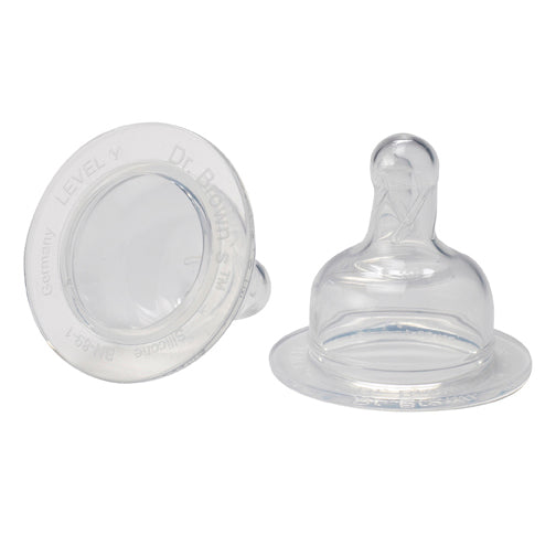 Created by a physician, Dr. Brown's Natural Flow baby bottles feature a patented internal vent system that helps reduce colic, spit-up, burping and gas. The positive pressure design allows babies to feed comfortably, because the vent system eliminates the air bubbles and vacuum. All parts are dishwasher safe. Two replacement silicone nipples, exclusively for Dr. Brown's Natural Flow Wide-Neck baby bottles. Y-Cut Nipples are ideal for babies 9+ months.