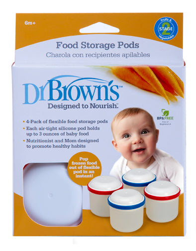 Silicone pods can go directly from freezer to microwave for quick and easy meal preparation. Four colorful food storage pods are convenient for food preparation and storage. Each air-tight silicone pod holds up to 3 ounces of baby food. Pop frozen food out of each flexible storage pod in an instant. Nutritionist and Mom designed to promote healthy habits. BPA Free. The Dr. Brown’s™ storage products help you to keep track of what’s on hand, to keep foods fresh, to preserve flavor and to keep the fridge and the diaper bag clean.