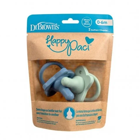 Introducing baby to a pacifier is made easy with the familiar Dr. Brown’s shape baby is used to. Plus, parents love the one-piece construction of the HappyPaci™. This lightweight, 100% silicone pacifier features a contoured butterfly-shaped shield that curves away from baby’s face for comfort, providing plenty of room for little noses and cheeks. Easy clean, dishwasher (top rack) and sterilizer safe. Comes in a variety of colors. BPA free. 0-6 months.